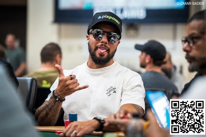 当时他手握3800万记分牌,大约50个大盲,场上平均记分牌为23BB。