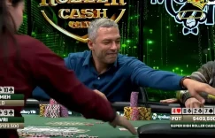 Chris用他的坚果牌继续过牌设置陷阱,Yoochan没有理由认为自己的顶Set被反超,于是下注$4,800,结果对手全压了$44,000。大部分扑克玩家遇到这样的情况可能会立刻跟注,但Yoochan并没有这样做。他陷入了长时间的思考,随后神奇地弃掉了手中的第二坚果牌。