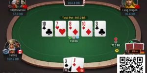 翻前,周乐东在BTN位3♥3♠直接allin4.15w,长码BB位思考良久,最终接下挑战并秀出了自己的A♠4♣