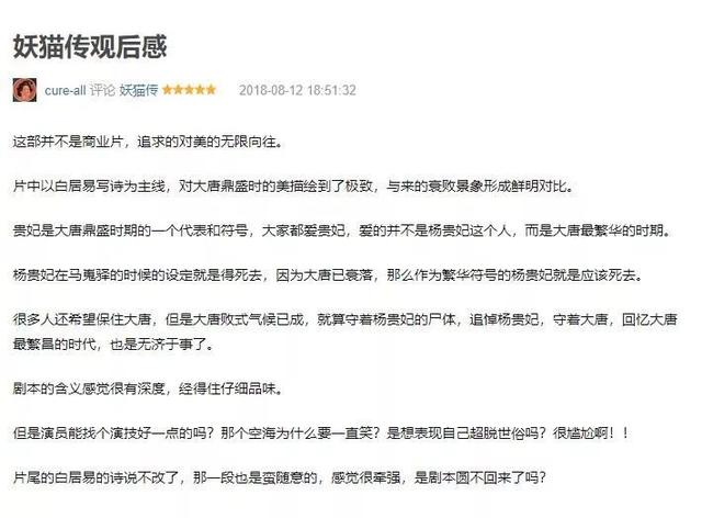 如果说我们对陈凯哥这个导演够熟悉,我们看过他以前倒了霸王别姬,那么我们就会对妖猫传有新的切入角度。在妖猫传上看到很多个陈凯哥,那个哭哭啼啼的李白大诗人是陈凯哥,那个为了一篇文章神魂颠倒的白居易也是他,那么那个守护心中那个美轮美奂的幻想的少年也是他这个就好像霸王别姬里面的程蝶衣也是陈凯哥一样。